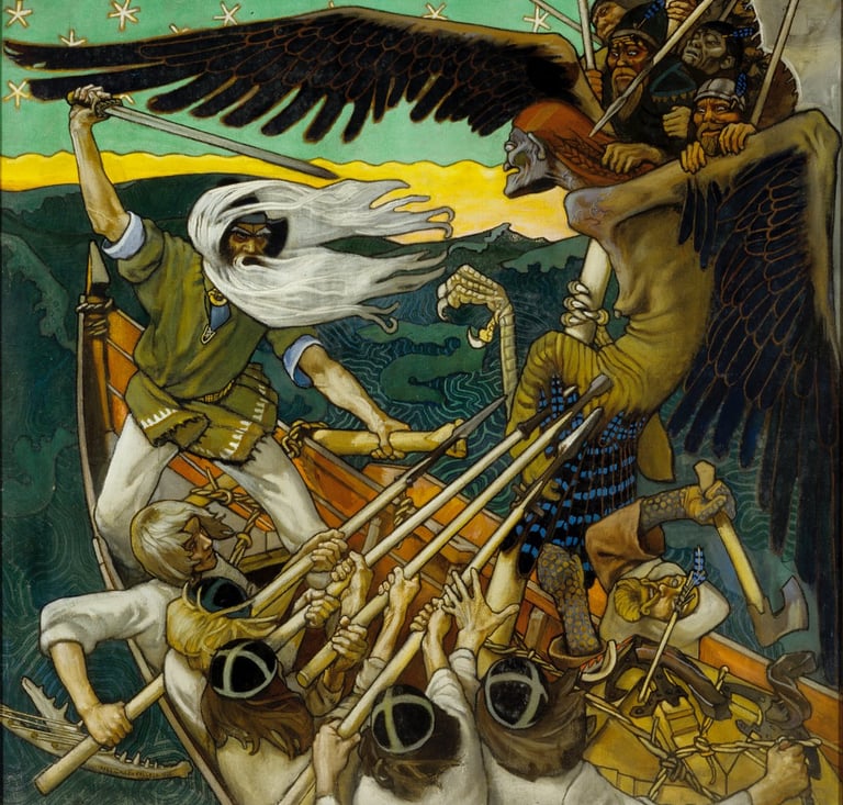 The central characters of the Kalevala embody themes of wisdom, craftsmanship, and struggle. Väinämöinen, the wise old singer, symbolizes knowledge and power through words and music. Ilmarinen, the eternal smith, represents craftsmanship and the ability to create through labor, most famously forging the sampo (mythical artifact of prosperity). Lemminkäinen, the reckless adventurer, illustrates passion and bravery, while Louhi, the Mistress of Pohjola, embodies the forces of opposition and mystery. These figures together create a mythic world where humans, gods, and nature interact constantly.